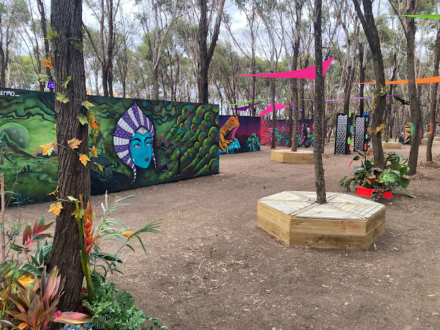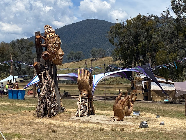 Up until this point my only real contact with Jenny and Sam had been via email and a very brief phone conversation, so I was a little surprised when Jenny came out that she was (its very hard to estimate these things) maybe in her early 60s? Jenny was lovely though, and we had a good 5 minute chat all about the founding of esoteric, our wedding/honeymoon, and Andi's cancer among other things, seemingly unconcerned about the long queue of vehicles behind us also waiting to get in. Jenny explained that herself and Sam were actually the land owners/ farmers and were approached by the other founder about the possibility of holding the festival on their land. Rather than simply renting out their land they went into full partnership together and they both play a major and pivotal roll in the organisation and running of Esoteric festival. I found it quite fascinating and unexpected that some of the founders and main organisers of Esoteric are actually 60 year old country Victorian farmers. She explained she isn't really into all this doof, doof, doof music, but she loves all the art and colours and all these happy, smiling people that come onto their land every year. It wasn’t what I was expecting anyway, but it was a charming and heart warming introduction to start the festival off with.